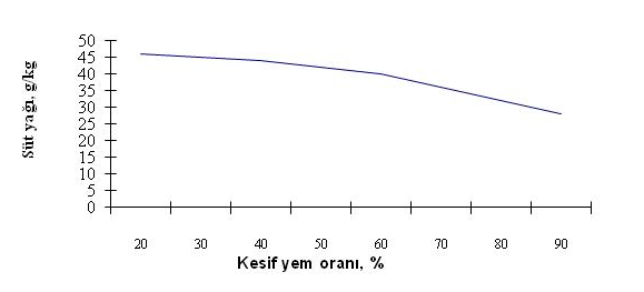 Kaba/Kesif yem Oranı: Rasyondaki kaba/kesif yem oranının düşürülmesi genellikle süt yağında düşmeye neden olur. Rasyonda kesif yem oranının yüksek olması rumende propiyonat lehine bir fermantasyonun gerçekleşmesine neden olurken, kaba yem oranı yüksek olan rasyonlar asetik asit lehine bir fermantasyon sağlarlar. Ayrıca kesif yem oranı yüksek olana rasyonlarda rumende pH hızlı bir şekilde düşerek selüloz sindirimini düşürür. Rasyon kuru maddesinde %50 ye kadar kaba yemin düşürülmesi durumunda süt yağındaki değişim sınırlı kalmaktadır. Ancak daha aşağılara çekilmesi sözü edilen sorunlara neden olmaktadır. Yani süt yağını düşürmektedir (Şekil 1).